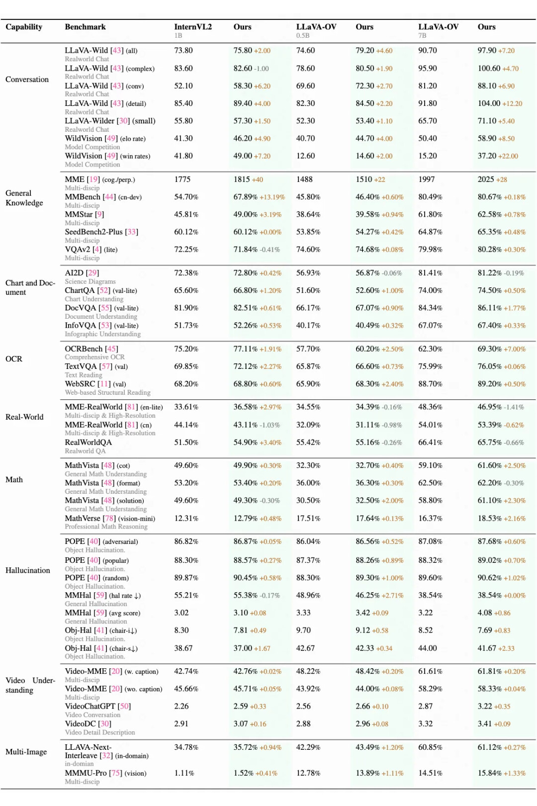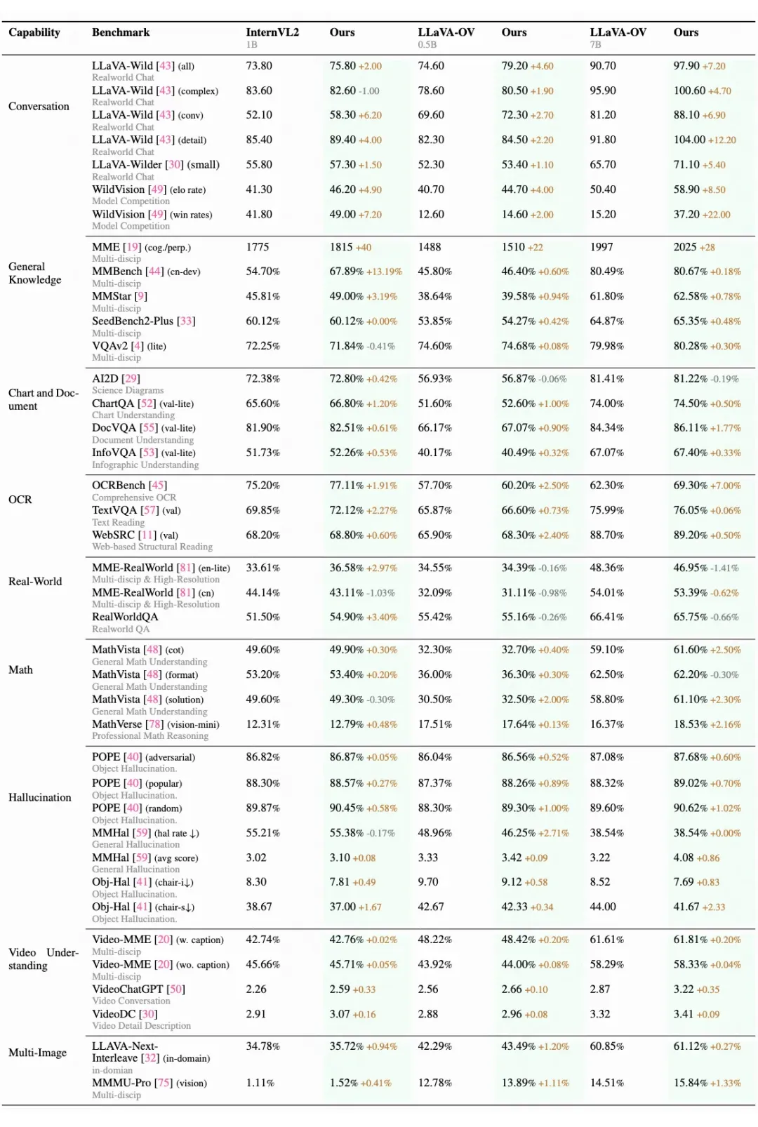 在幻觉、数学推理、多图像和视频理解方面的广泛提升:对齐后的模型在这些领域表现出显著的提升。有趣的是,尽管我们的数据集中缺乏专门的多图像数据,模型在多图像任务中的表现依然显著提升。这表明我们数据集的多样性有助于模型在多个维度上进行更好的泛化。