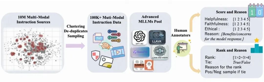数据过滤与模型响应生成:通过预定义的多选题,长文本等类别均匀采样,确保少数类也有足够的样本。同时采用了 knn 聚类并采样的策略,保证数据的 diversity。响应生成使用到了 Qwen2-VL-72B、LLaVA-OV-72B、GPT-4o 和 Claude 3.5-sonnet 等最先进的 MLLM。