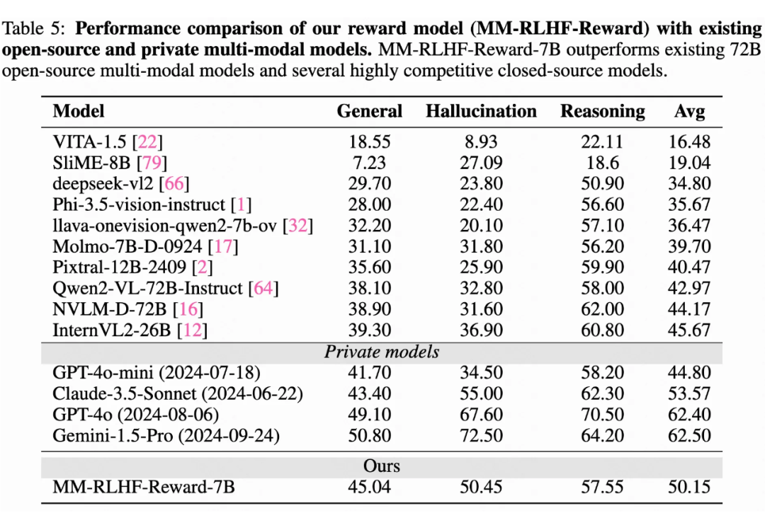 创新的奖励模型:提出了基于批评的奖励模型(Critique-Based Reward Model),该模型首先对模型输出进行批评,然后再进行评分。这一方法相比传统的标量奖励机制,提供了更好的可解释性和更多信息量的反馈,基于该方法的模型只需要 7B size,在 reward model benchmark 就明显优于现有公开的 72B-size 的 MLLM。