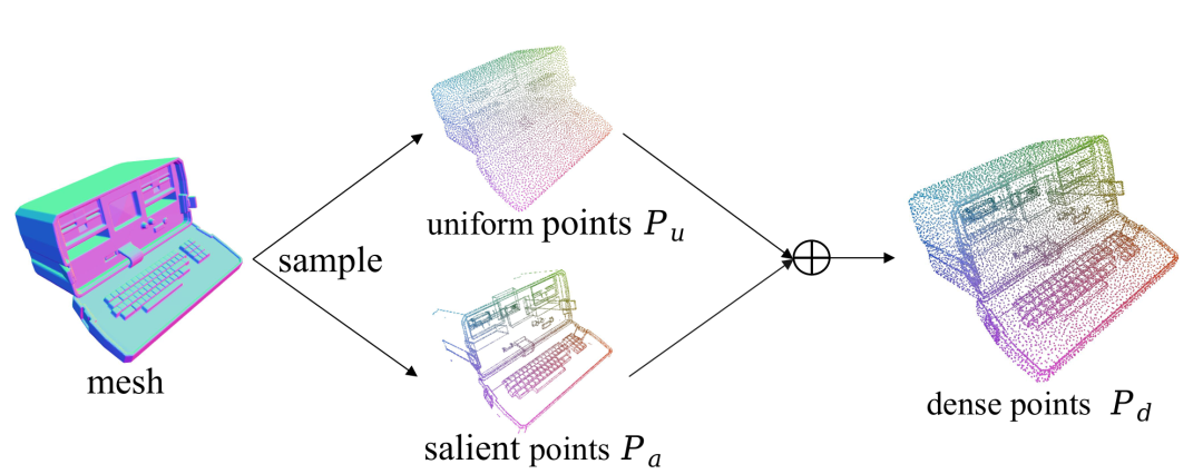 ,相连边缘产生的重复顶点仅保留一份:。令表示该集合中唯一几何顶点的数量。给定显著区域目标点数,当显著顶点过多时,通过最远点采样法 (Farthest Point Sampling, FPS) 进行顶点下采样;当显著顶点不足,通过对显著边缘增加采样来补充数据,从而得到显著区域采样点