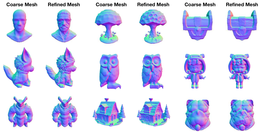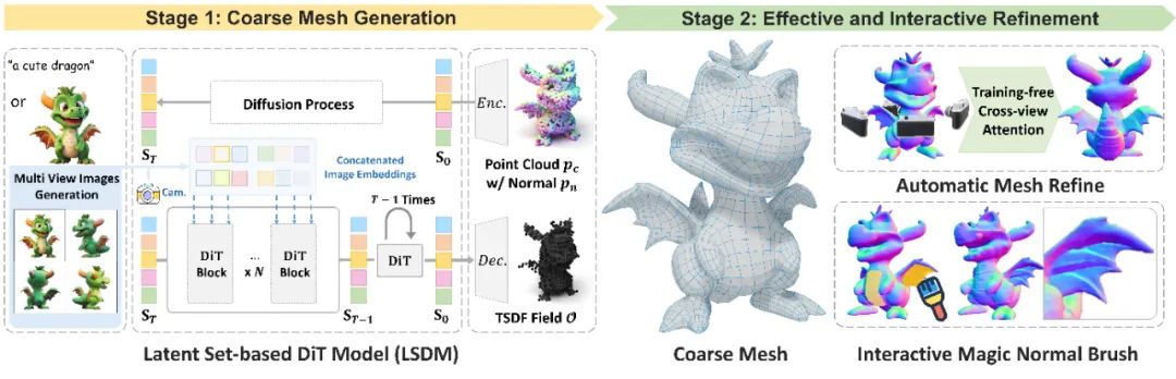 在 3D-VAE 模型的基础上,香港科技大学与光影焕像团队进一步提出了 Craftsman3D 算法方案,该方案借鉴了传统建模流程,能够快速生成高质量的 3D 模型,以进一步生成满足设计师对高质量三维模型的生成要求。此方法在 CVPR 中获得审稿人一致满分评价,它融合了原生 3D 大模型以及实时几何细节优化两大部分:首先由原生三维大模型生成初始模型,随后通过实时可交互几何细化操作,短短几十秒内即可生成具备高质量几何细节的三维模型。