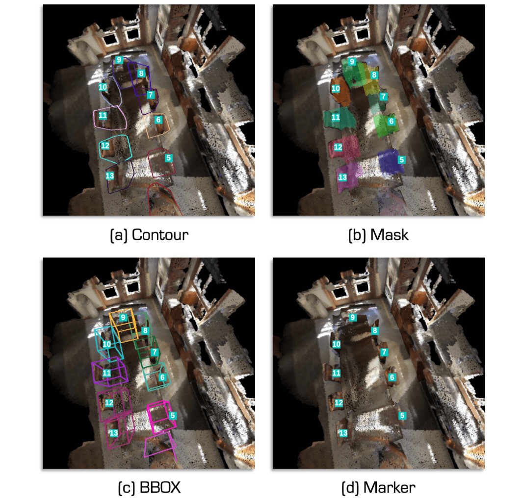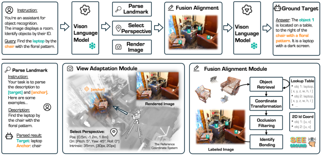 SeeGround 通过视觉提示增强(Visual Prompting) 技术,在 2D 渲染图像中标注出关键物体的位置,使 VLM 能够识别出 2D 画面中的具体目标物体,并将其与 3D 坐标数据关联。