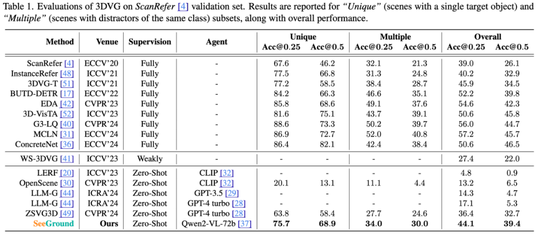 为了验证 SeeGround 在零样本 3D 视觉定位(3DVG)任务中的有效性,作者在 ScanRefer 和 Nr3D 数据集上进行了广泛的实验。结果表明,SeeGround 在多个基准测试中显著超越了现有零样本方法,并在某些任务上接近弱监督甚至全监督方法的性能。