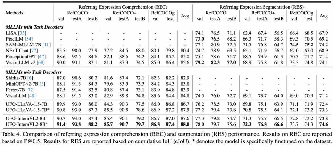 无需任务解码器,UFO 在引用表达式理解(REC)和分割(RES)两种任务展现出优越的性能。