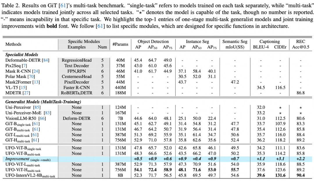 UFO 在 GiT 提出的多任务基准上取得显著提升,在 COCO 实例分割上相比 GiT-H 提升 12.3 mAP,在 ADE20K 语义分割上提升 3.3 mIoU。
