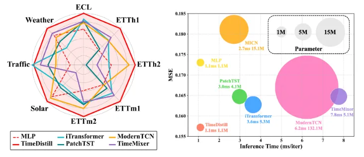 TimeDistill提出了一种跨架构知识蒸馏框架,旨在提升轻量级时序预测模型的效率和精度。通过将复杂模型的知识迁移到MLP,实现高效且准确的预测。