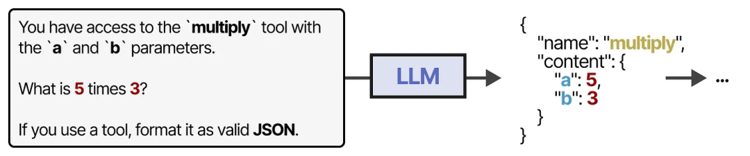 为了实际使用某个工具,LLM 需要生成与该工具 API 兼容的文本。我们通常期望生成可以格式化为 JSON 的字符串,这样可以轻松地将其传递给代码解释器。