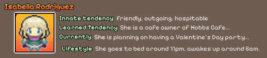 赋予每个生成式代理的配置文件使其以独特的方式行为,有助于创造出更有趣和动态的行为。