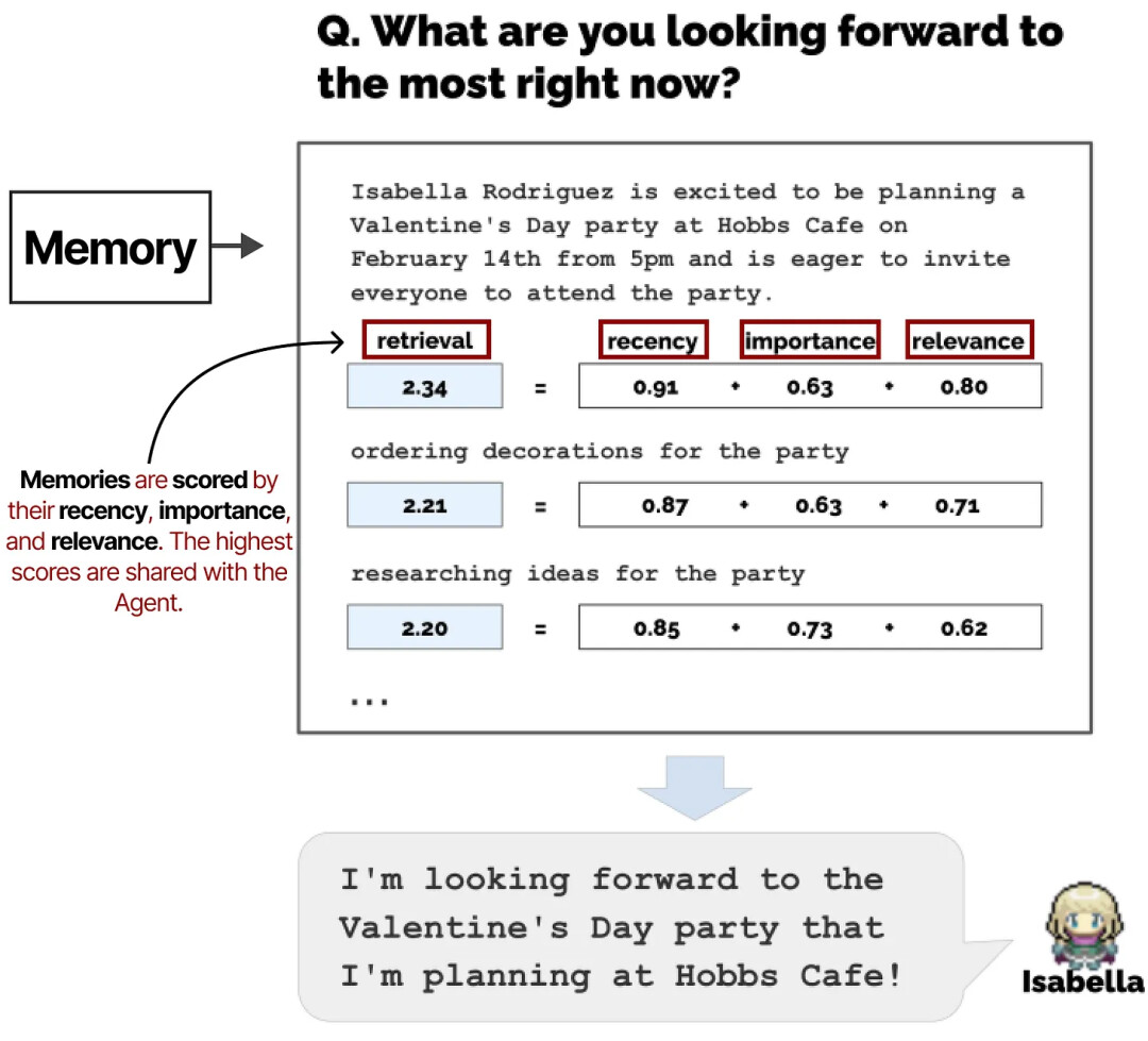 对于任何给定的下一步或问题,记忆会被检索出来,并根据其新近性、重要性和相关性进行评分。得分最高的记忆会被共享给 Agent。