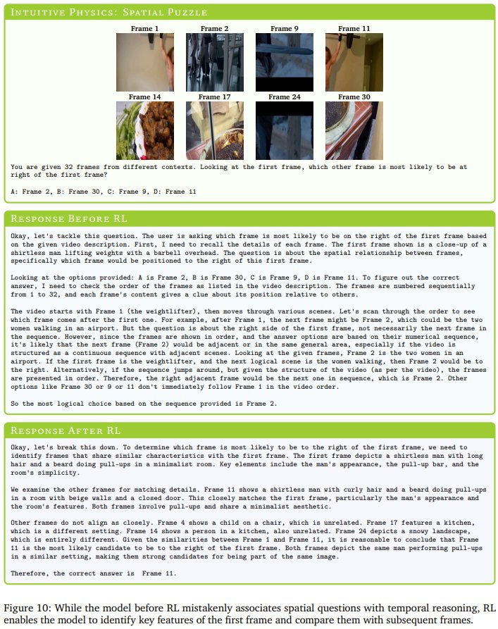 类似地,在图 10 中可以看到,有 RL 的模型倾向于将空间问题与时间推理混淆。虽然他们可以感知到第二帧与第一帧缺乏相似性,但它们固有的偏见会导致它们遵循默认的视频顺序,这表明它们更多地依赖于时间线索而不是真正的空间理解。