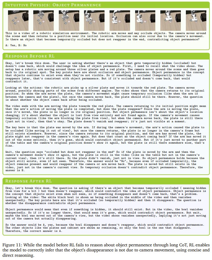 最后,图 11 表明,即使 CoT 较长,没有物理 AI RL 的模型也会难以理解物体持久性,经常难以推理物体的出现和消失。相比之下,经过 RL 的模型可通过直接而简洁的推理快速得出结论。