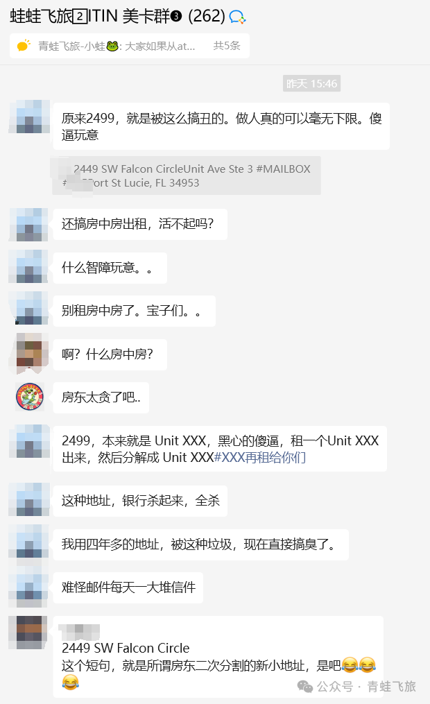 再解释一下这个佛罗里达2449号的地址,很多人都是在ATMB上面租的,很有名,估计挂了几千人,2449号是地址房号,又细分了二级编号Ste 3,再细分了三级编号#56XX,估计是被人层层转租或者是房东加了无数人了。这么多人不出意外肯定是要出意外的!