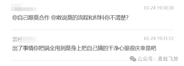 某松质疑的小蛙“甩锅”、“你自己跟莫合作 你敢说莫的流程和材料你不清楚”这一点,我完全敢呀。