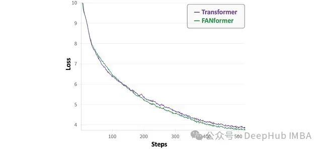 在训练初期阶段,FANformer的损失下降速度相对较慢,可能是因为模型尚未有效识别数据中的周期性模式。然而,随着训练进行,FANformer的收敛速度超过了标准Transformer。