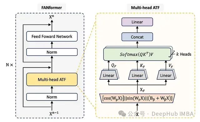 值得注意的是,ATF(X)在数学上等价于Attention(FANLayer′(X)),这意味着傅里叶变换并不改变注意力机制本身,而是改变了输入表示的计算方式。这种设计使FANformer能够与FlashAttention等高级注意力优化技术兼容。