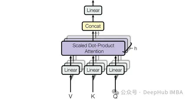 传统多头注意力机制,其中Q、K、V通过每个头的可学习权重矩阵直接从输入嵌入X计算(数据来源:研究论文《Attention Is All You Need》)