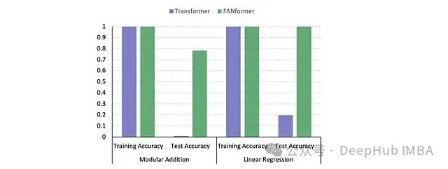 实验显示,两种架构在训练数据集上都达到了接近完美的准确率。然而,在测试数据上,Transformer表现出明显的性能下降。