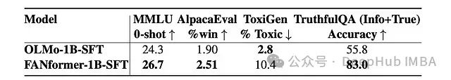评估结果再次表明,FANformer-1B-SFT在MMLU、AlpacaEval和TruthfulQA基准上的性能优于OLMo-1B-SFT。