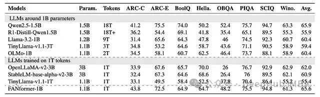 FANformer-1B与其他同等级开源LLM在下游任务上的零样本性能对比。