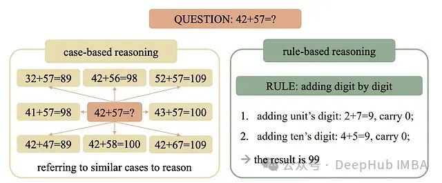 2024年的一项研究表明,基于Transformer的LLM主要通过基于案例的推理解决数学问题,即记忆训练数据中的特定示例,并在推理过程中通过寻找相似案例进行泛化。这与基于规则的推理不同,后者涉及学习潜在数学规则并系统性地应用这些规则来解决问题。