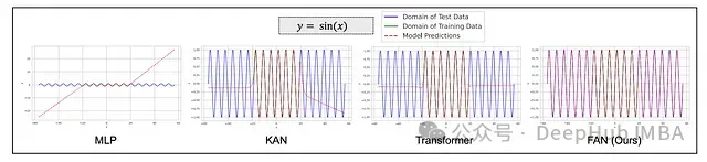 傅里叶分析网络(FAN)通过将傅里叶分析原理直接整合到神经网络结构中,有效解决了这一问题。如下图所示,相较于MLP、KAN和Transformer,FAN能够更准确地对周期性sin函数进行建模。
