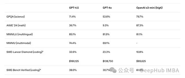 GPT-4.5与其他OpenAI模型的性能对比(数据来源:OpenAI博客文章《Introducing GPT-4.5》)