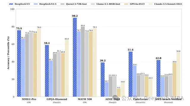 DeepSeek-V3与其他LLM的性能对比(数据来源:ArXiv研究论文《DeepSeek-V3 Technical Report》)