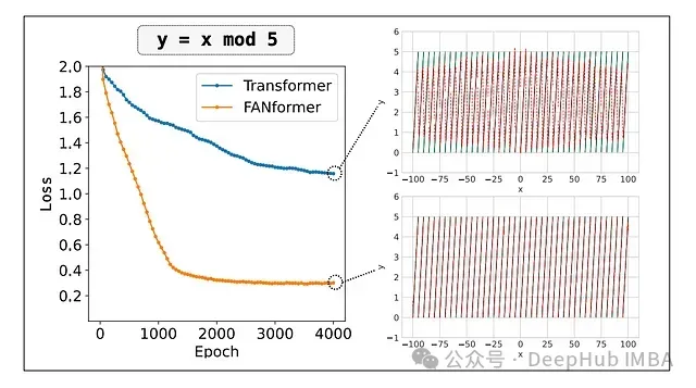 下图展示了一个典型案例,即使在充足的训练资源条件下,Transformer也难以有效地对简单的mod函数进行建模。