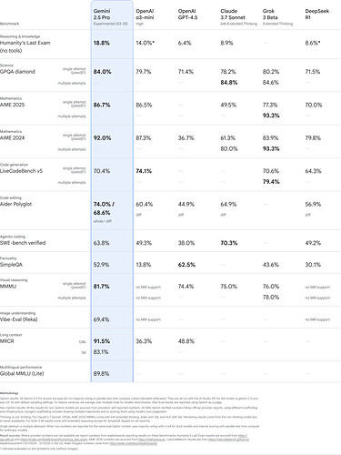 据谷歌称,这个最新版本将“显著增强的基础模型与经过改进的后训练设计”结合起来,由此获得更好的整体性能。该公司宣称,Gemini 2.5 Pro 实验版在理解能力、数学能力、编码能力等常见的 AI 基准测试指标上均已领先于 OpenAI、Anthropic、xAI 乃至 DeepSeek。