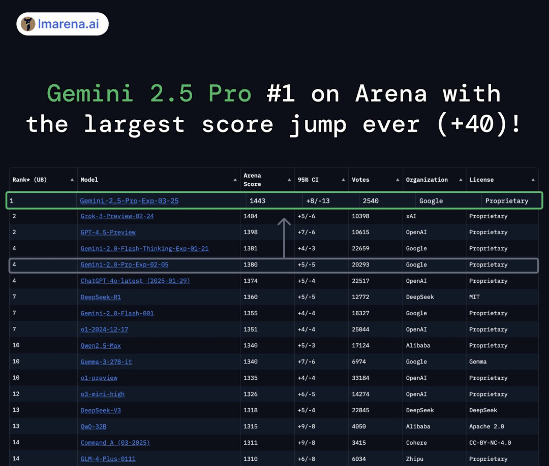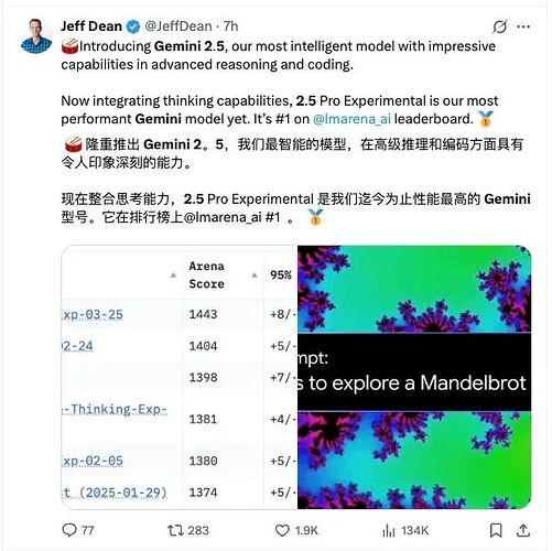 DeepMind CEO Demis Hassabis 在 X 上发帖称,Gemini 2.5 Pro 是“一款非常棒的先进模型,在 LMArena 上以惊人的 +39 ELO 得分排名第一,而且在多模态推理、编码与 STEM 等方面均实现了显著改进。”