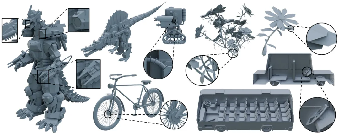 然而,当前主流 3D 表示方法,比如隐式场(SDF/Occupancy)、显式网格、点云,要么对于细节的捕捉效果较差,并难以实现对高面数、复杂拓扑结构的直接重建;要么在高分辨率下实时渲染时产生巨大的内存开销。这就导致业界很少有模型能够生成媲美专业三维数字雕刻建模软件 ZBrush 所创作出的的高精细、高复杂度作品。