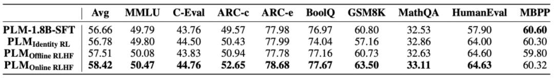 实验表明,PLM 表现颇具竞争力,平均分(57.29)位列第三,仅次于 Qwen2.5-1.5B(59.25)和 Yulan-Mini-2.4B(57.51)。PLM-1.8B 在 HumanEval 中获得了所有模型中的最高分,在 ARC-C、ARC-E、MBPP 和 BoolQ 中排名第二,略逊于行业领先的 Qwen2.5-1.5B,需指出的是,Qwen 系列使用了 18T 闭源语料库。
