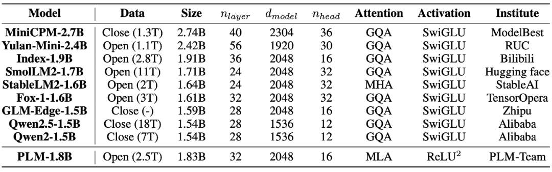 PLM 采用独特的模型架构,对比的基线模型涵盖了当前最先进的 2B 参数量级模型,具体对比如下。
