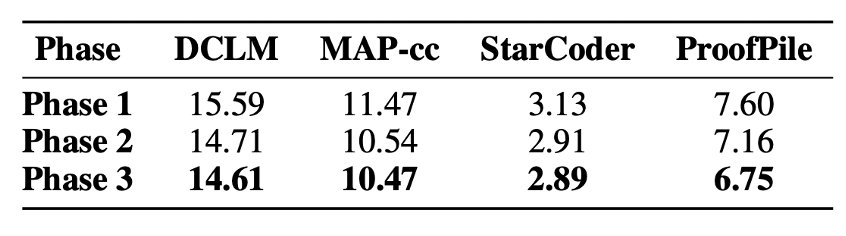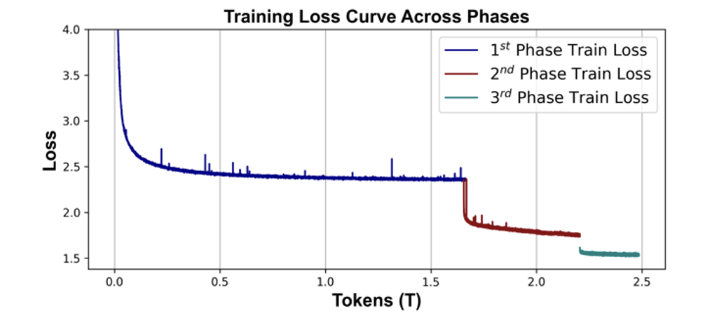第一阶段累计约 1.65T 的 Token。这个阶段中,学习率是属于预热和稳定的阶段,模型的 Loss 也在 2.3 附近有收敛趋势。第二阶段累计约 550B 的 Token。在这个阶段,模型的 Loss 随着学习的衰减快速下降。第三阶段累计约 280B 的 Token。