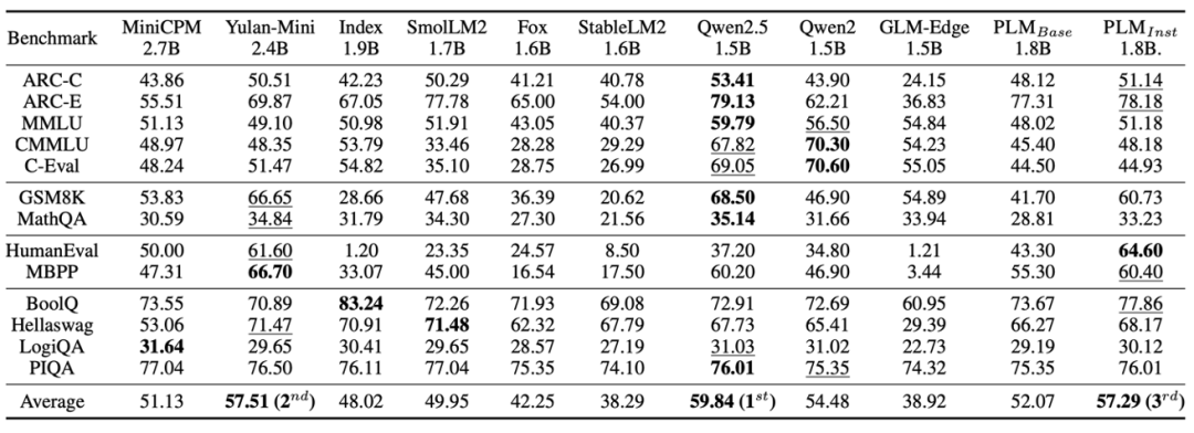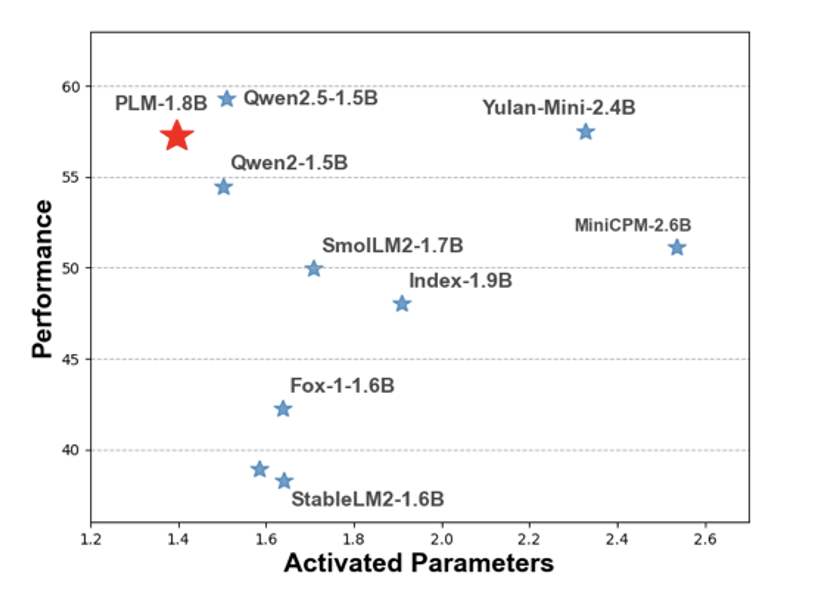 PLM 是首个结合 MLA 注意力机制与 ReLU2 激活 FFN 的架构。评估结果表明,PLM 的表现优于现有在公开数据上训练的小型语言模型,性能接近利用 18T tokens 训练的 Qwen2.5-1.5B 模型,同时保持最低激活参数数量。