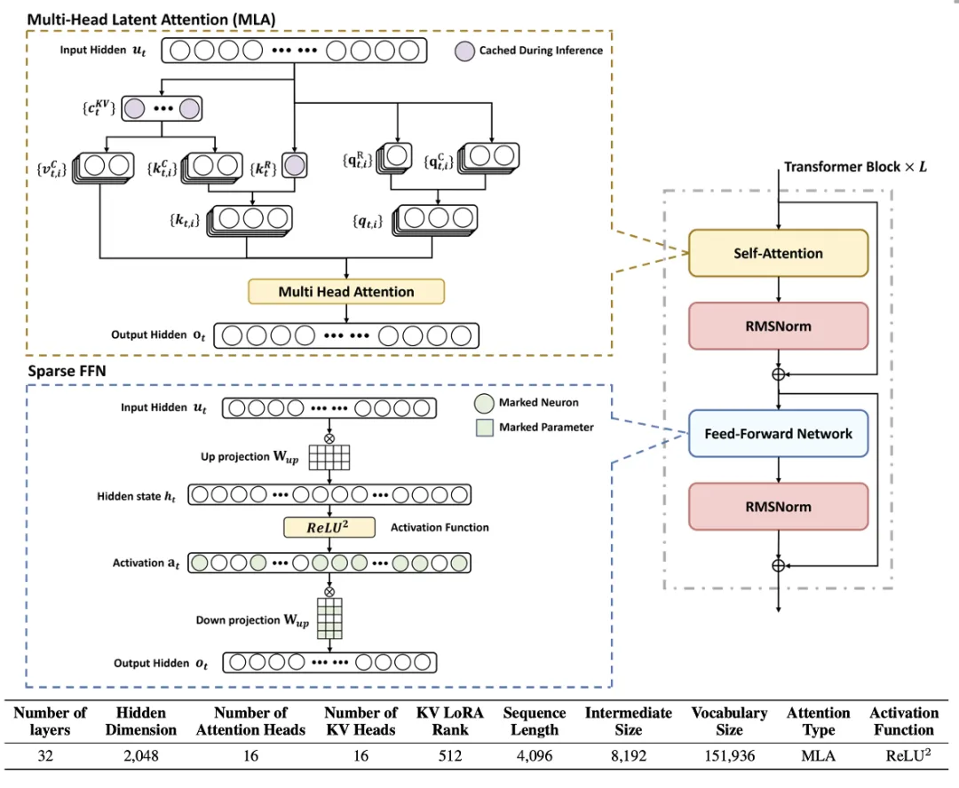 这个设计使得 MLP 层激活稀疏度达到 90.9%,整体计算量减少 26%。此外,从硬件角度出发,零值激活能够触发指令级优化。这一设计理念成功地将模型与系统的联合优化整合到大语言模型架构中。