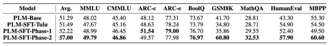 监督微调数据遵循「由浅入深」的数据准备方法,以渐进的方式进行监督微调过程。PLM 的 SFT 训练分为基本指令微调和高难度指令微调。下面是各个阶段的提升效果。