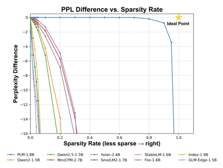 具体而言,PLM 团队绘制了稀疏率(0~1)与困惑度差异的关系图,以分析神经激活减少的性能成本。不同模型的曲线揭示了各自对稀疏度的敏感性。理论上的「理想点」—— 完全稀疏且困惑度不增加 —— 是无法实现的,因为 MLP 层完全停用将损害模型质量。