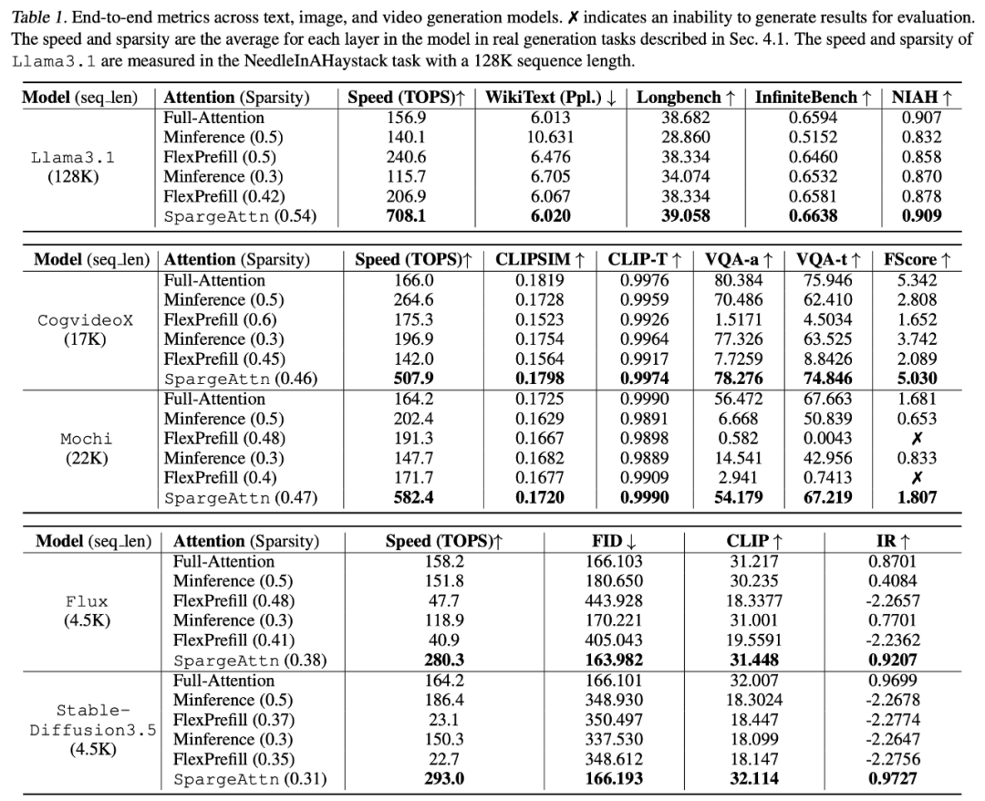 下表展示了 SpargeAttn 在各模型上的稀疏度,Attention 速度,以及各任务上的端到端精度,可以发现 SpargeAttn 在保证了加速的同时没有影响模型精度:(注:此论文中的所有实验都是基于 SageAttention 实现,目前 Github 仓库中已有基于 SageAttention2 的实现,进一步提供了 30% 的加速。