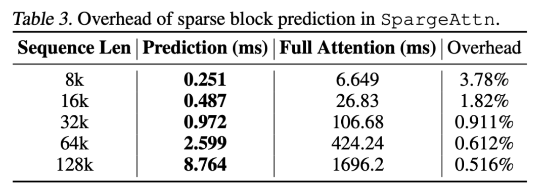 值得一提的是,此前的稀疏 Attention 工作很多无法实际使用的原因之一是稀疏预测部分的 Overhead 较大,而 SpargeAttn 团队还将稀疏预测部分的代码进行了极致优化,将 Overhead 压缩到了几乎在各种长度的序列下都可以忽略的地步: