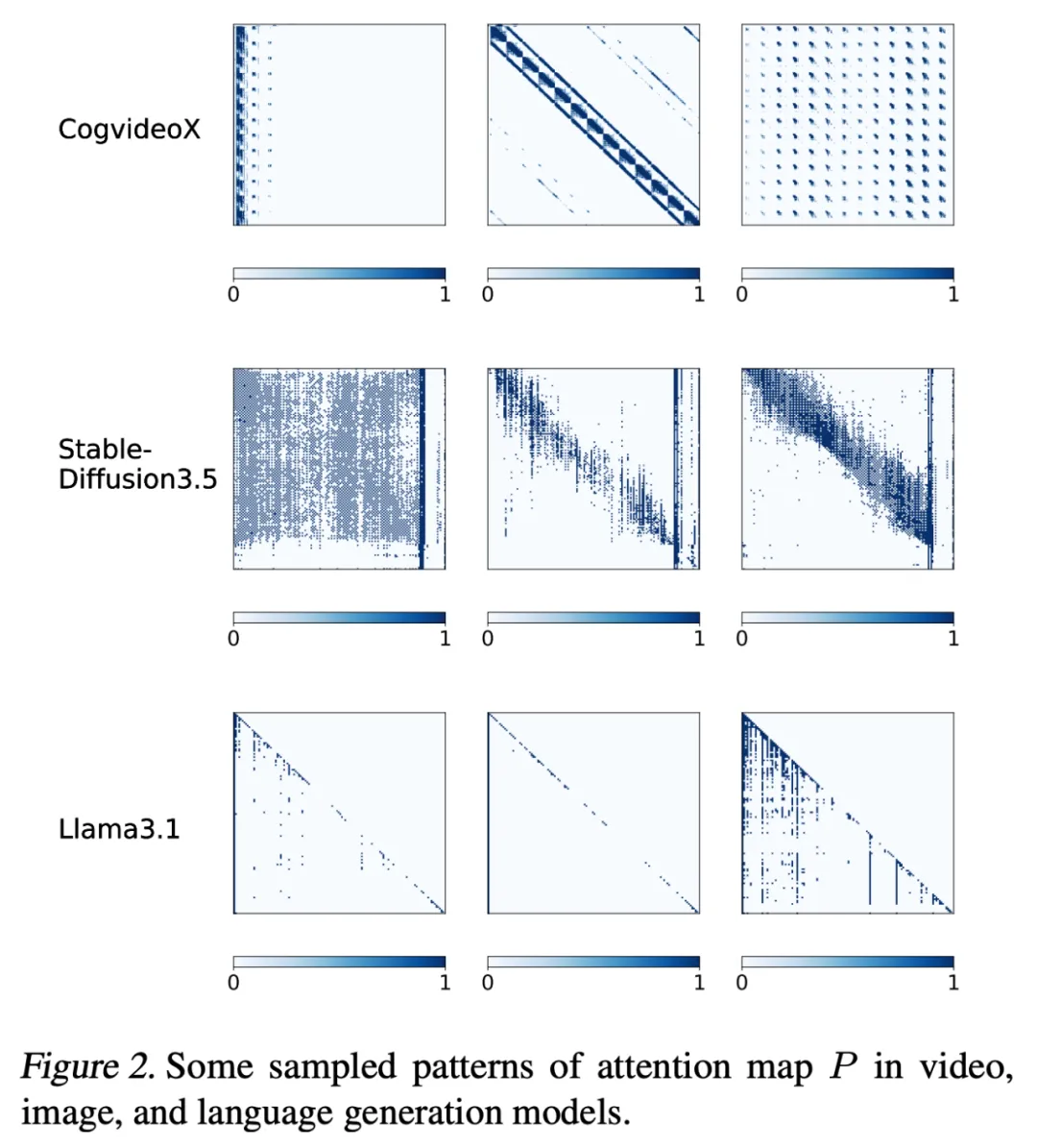 通用性:Attention 虽然具备稀疏性质,但是其稀疏形状在不同的模型甚至同一模型的不同层中都是不同的,体现出很强的动态性。如图 1 所示,前两种模型分别为视频模型和图像生成模型,这两个模型中的 Attention 的稀疏形状相比语言模型更加没有规律。设计一种各种模型通用的稀疏 Attention 是困难的。