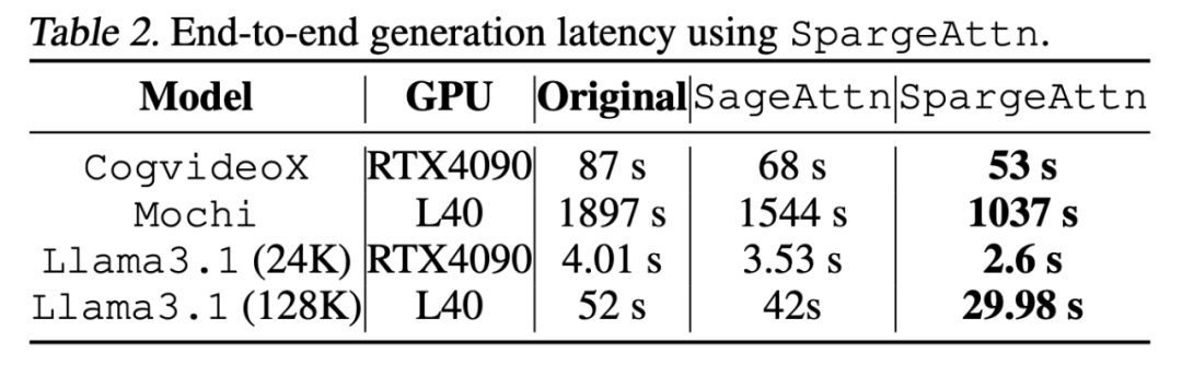 下表展示了对于各模型的端到端的加速效果,以视频生成模型 Mochi 为例,SpargeAttn 提供了近两倍的端到端加速效果:(注:此论文中的所有实验都是基于 SageAttention 实现,目前 Github 仓库中已有基于 SageAttention2 的实现,进一步提供了 30% 的加速)