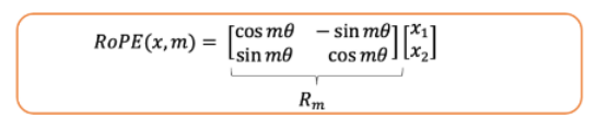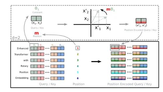 在旋转位置嵌入中,给定一个token嵌入及其位置,会生成一个包含位置信息的新嵌入: