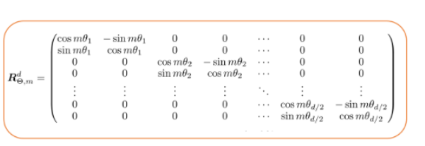 通常情况下,模型的嵌入维度不是2,而是比2大得多。那么旋转矩阵会如何变化?Roformer论文的作者[6]建议如下: