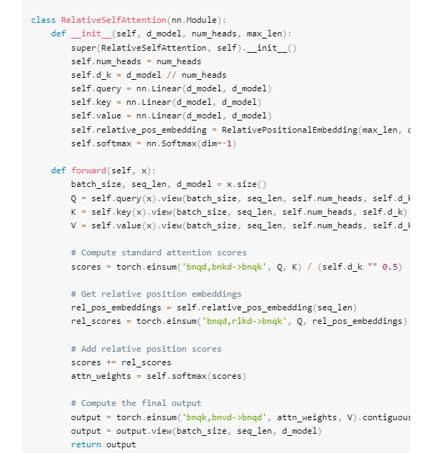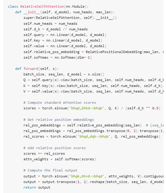 下一行,rel_pos_embeddings=self.relative_posenbedding(seq_len)检索序列中所有现有相对距离的相对位置嵌入,它是(seq_len,seq_len,dk)。然后将其矩阵转置,将其更改为(d_k,seq_len,seg_len)。下一行rel scores=torch.einsum('bhqddqk->bhqk',Q,rel pos enbeddings)计算相对位置嵌入对自注意力机制中注意力得分的贡献。这就是之前看到的方程中的相对位置偏置矩阵 B。