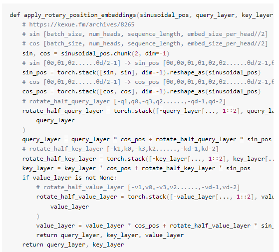 注意,此行query_layer=querylayer*cos_pos+rotate halfquery_layer*sin_pos是根据上一节中提到的高效计算方法进行计算的。