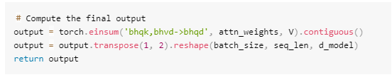 Line scores=torch.einsum('bhqd,bhkd->bhqk',Q,K)/(self.d k**0.5)是指定复杂张量操作的符号,它用于计算查询向量和密钥向量之间的点积,等式'bhqd,bhkd->bhqk' 可以解释为: