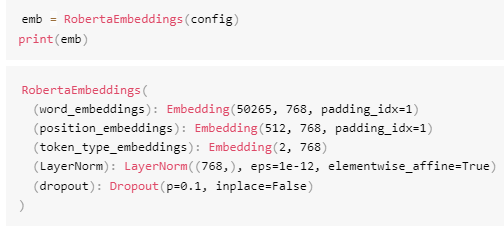 从配置参数可见:"position_embedding_type": "absolute"最大位置嵌入长度为512("max_position_embeddings": 512)。实例化RobertaEmbedding层:
