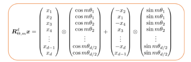 也就是说,对于位置m和嵌入维度d,旋转矩阵由d/2旋转矩组成,每个旋转矩是2比2。此外,由于这种结构是稀疏的,作者[6]推荐一种计算效率高的方法,用标记嵌入向量x计算token嵌入。