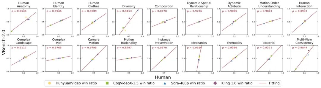 下图中,横轴代表不同维度的人工评测结果,纵轴则展示了 VBench-2.0 方法自动评测的结果,可以看到我们方法在各个维度都与人类感知高度对齐。